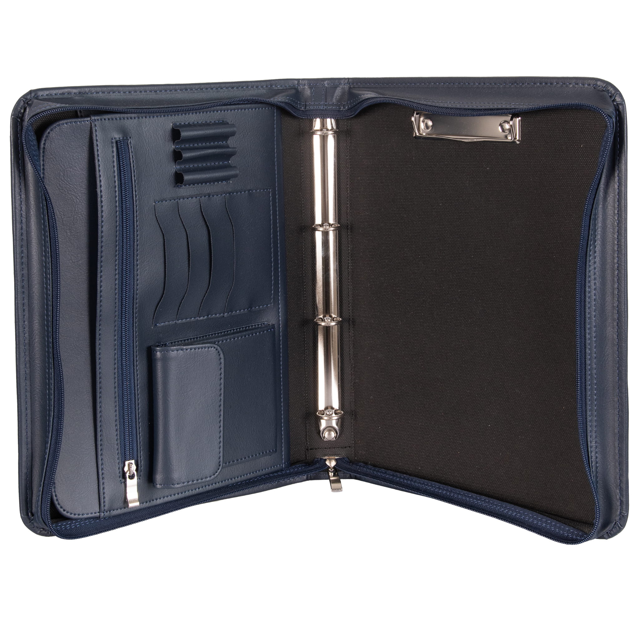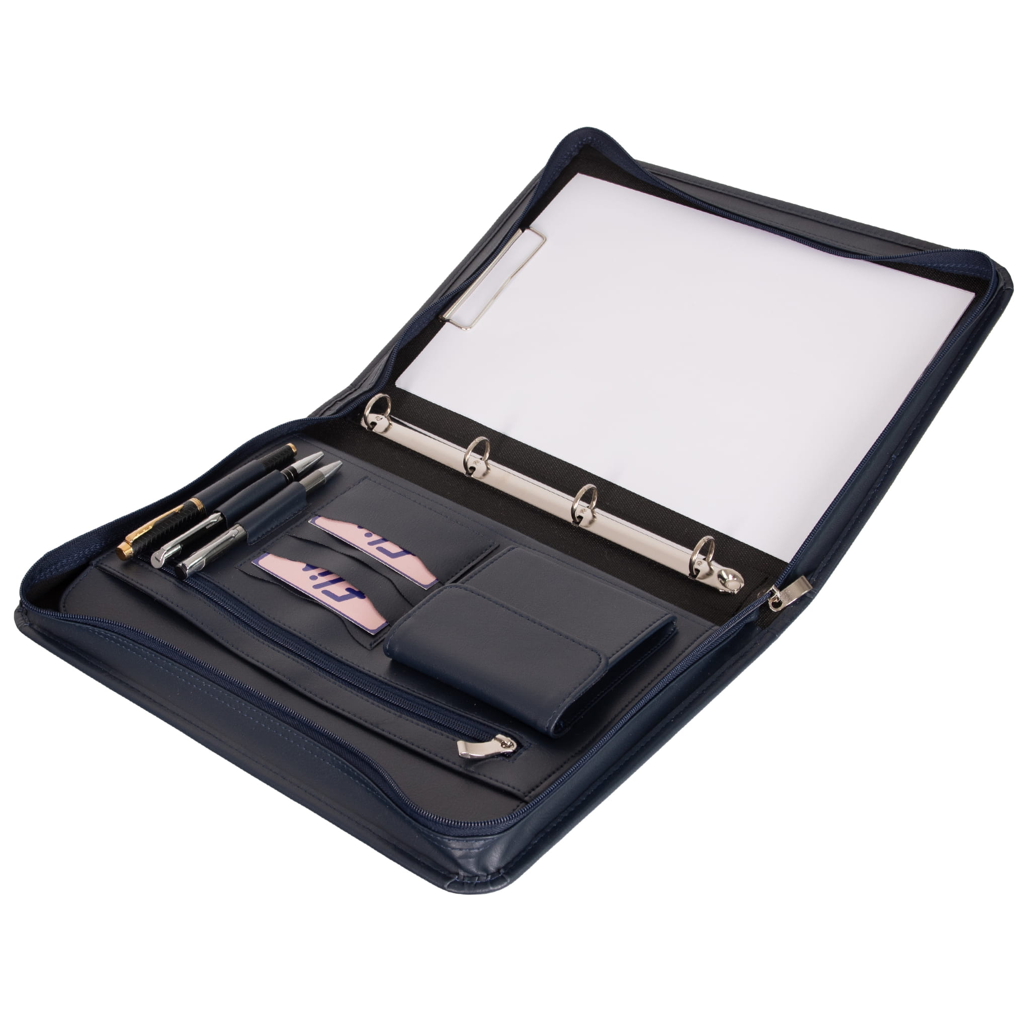 - wewnątrz naszej aktówki znajdziesz 2 wygodne przegrody, miejsce na wizytówki, długopisy i pieczątkę, a dodatkowo klips na dokumenty A4 oraz mechanizm ringowy na koszulki,