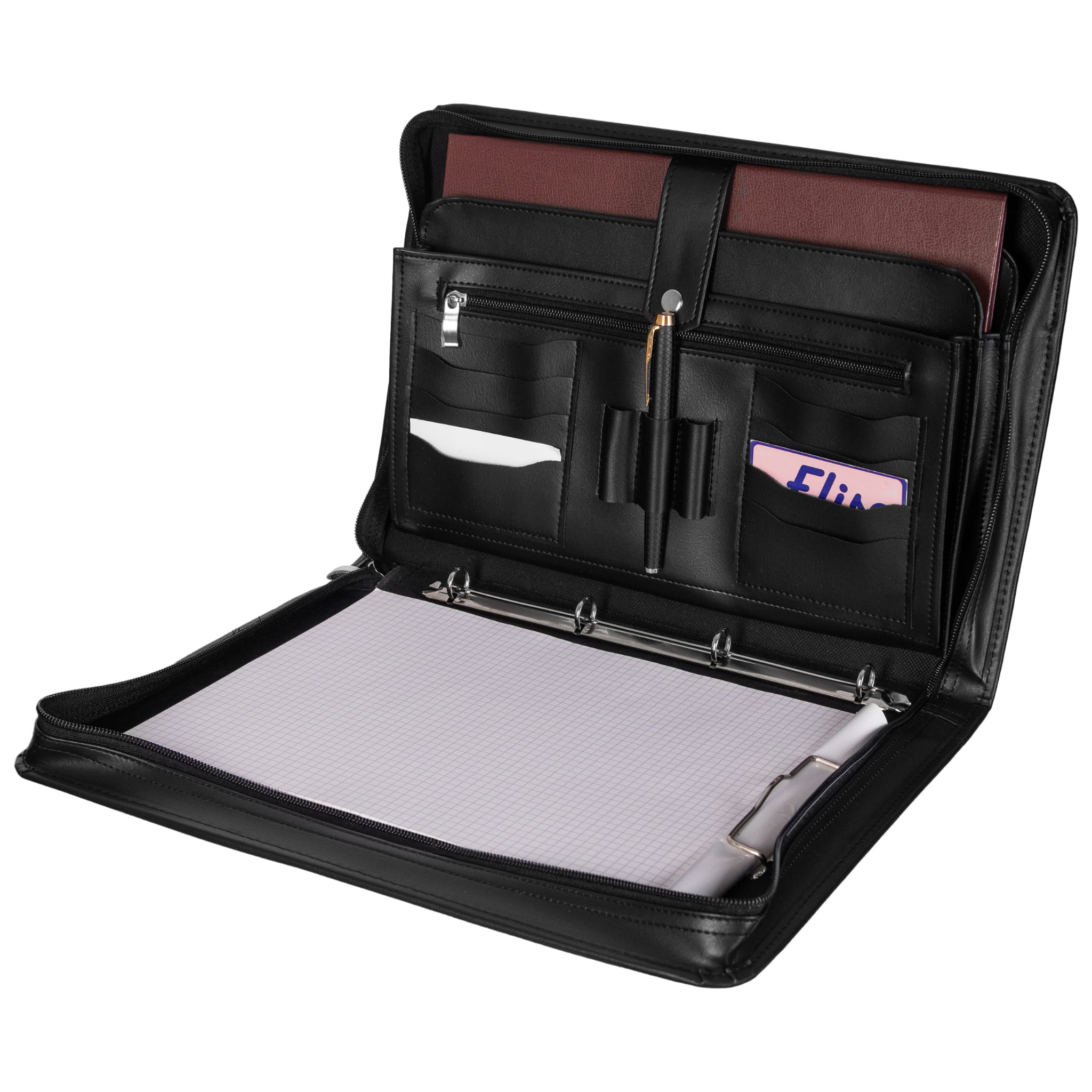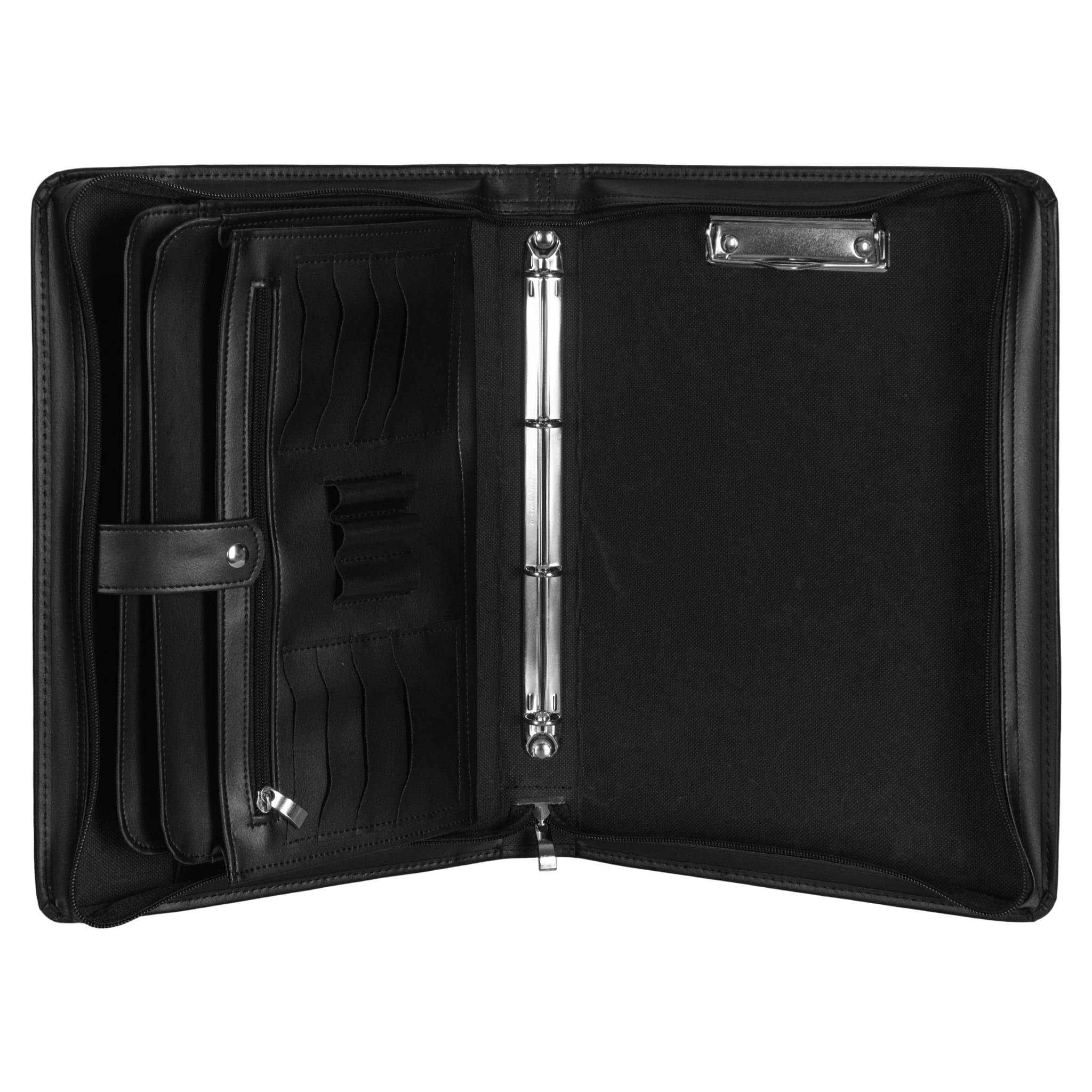 - wewnątrz naszej aktówki znajdziesz 4 wygodne przegrody w tym jedna na zamek, miejsce na wizytówki, dowody rejestracyjne, długopisy, a dodatkowo klips na dokumenty A4 oraz mechanizm ringowy na koszulki,