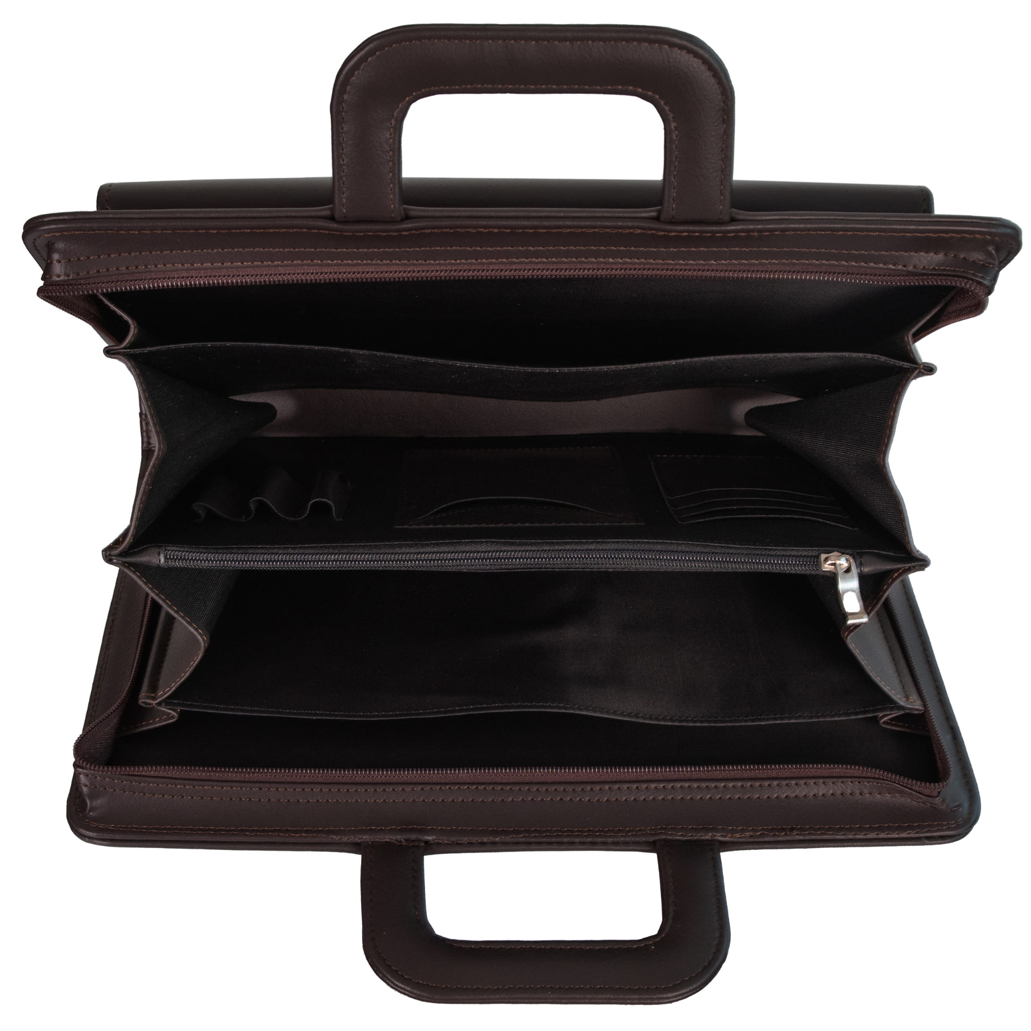 Wewnątrz tego modelu aktówki znajdują się cztery pojemne komory, dodatkowo pomiędzy komorami znajduje sie kieszeń zapinana na zamek. W środku znajduje się miejsce do przechowywania wizytówek oraz długopisów.