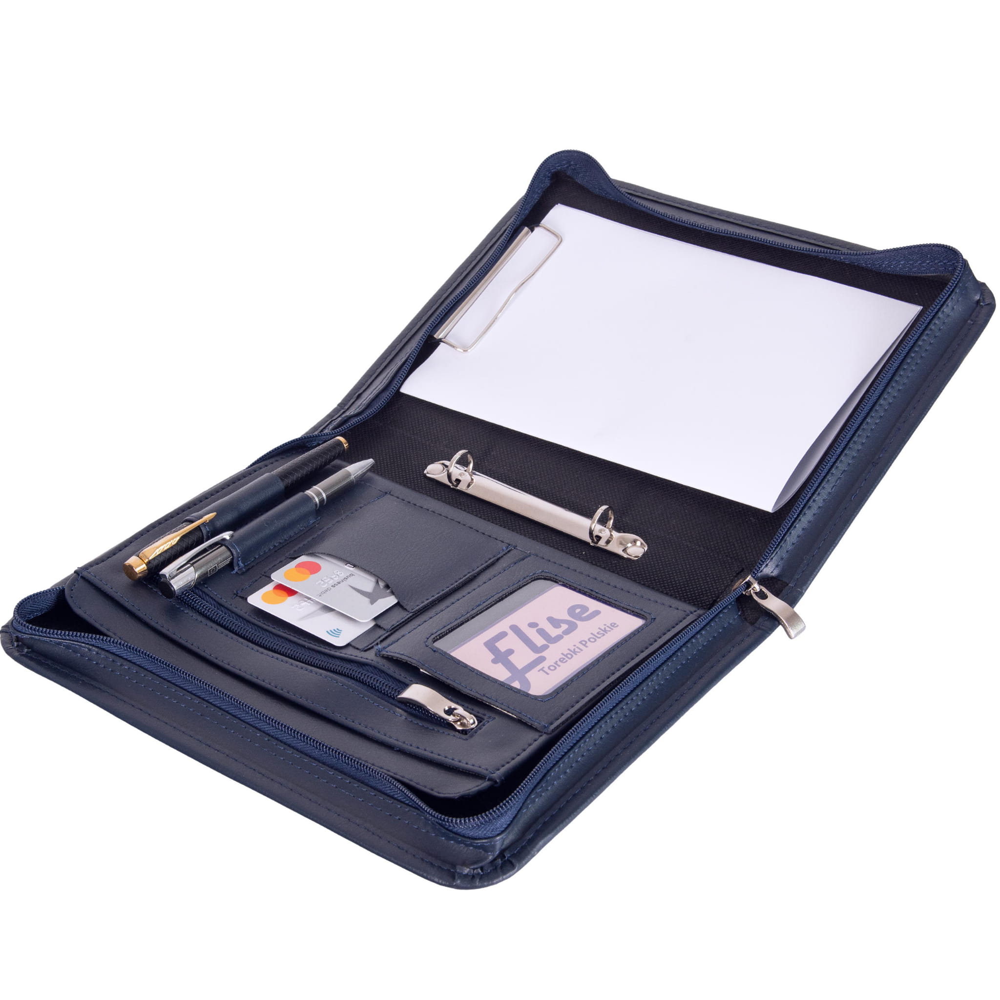 Biwuar posiada 2 przegrody, kieszonkę na zamek, a także miejsce na wizytówki i długopisy. Specjalny klips umożliwia przymocowanie dokumentów w rozmiarze A5. Aktówka jest też zaopatrzona w mechanizm ringowy na koszulki oraz niezawodny i starannie wykonany zamek błyskawiczny. Proponujemy model w kolorze czarnym lub czekoladowym, ze srebrnymi okuciami.
