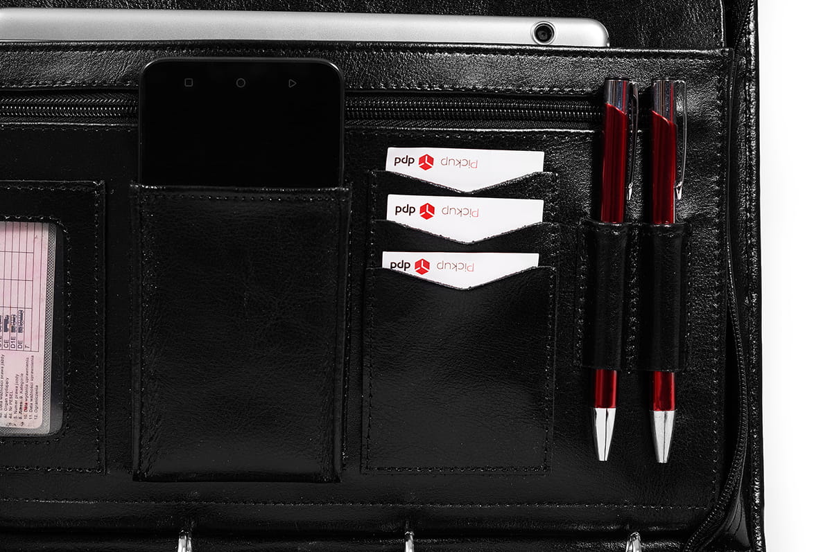 Aktówka męska skórzana ma zapinane na zamek błyskawiczny kieszonki, a także miejsce na wizytówki, telefon komórkowy, dowód tożsamości oraz długopisy. Wszystkie przegrody i ich zamknięcia są solidnie wykonane i dobrze dopasowane, aby zapewnić bezpieczeństwo przechowywanym przedmiotom.