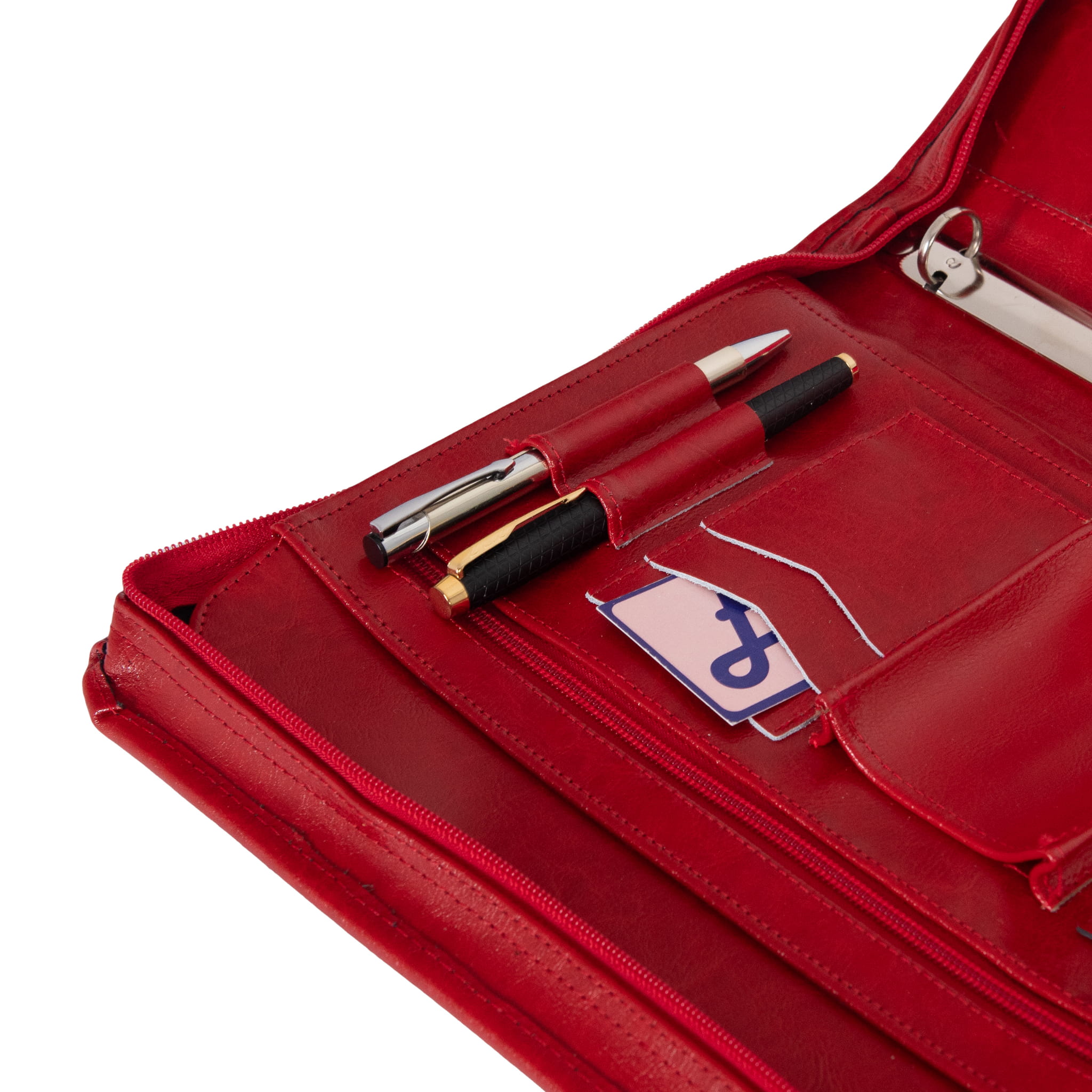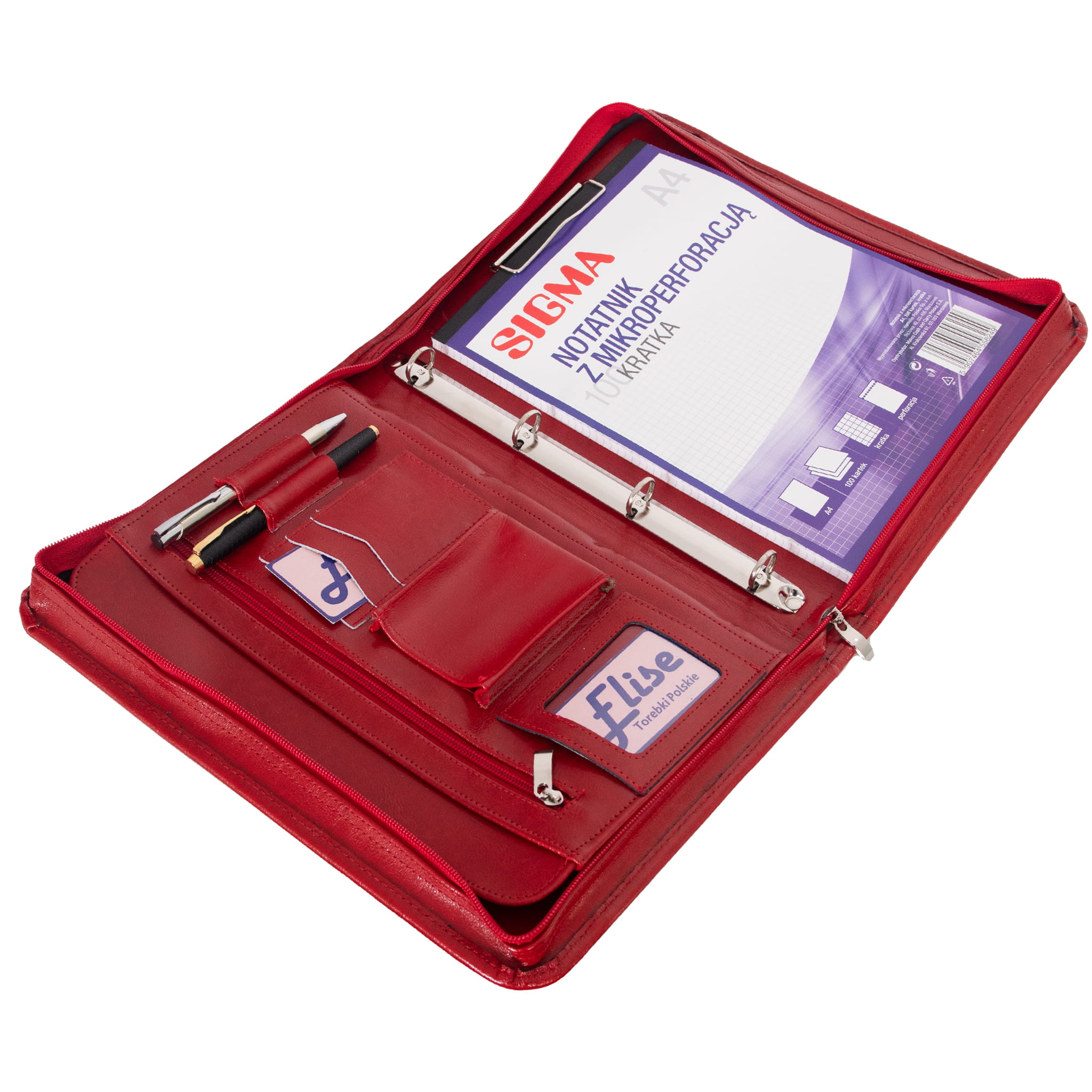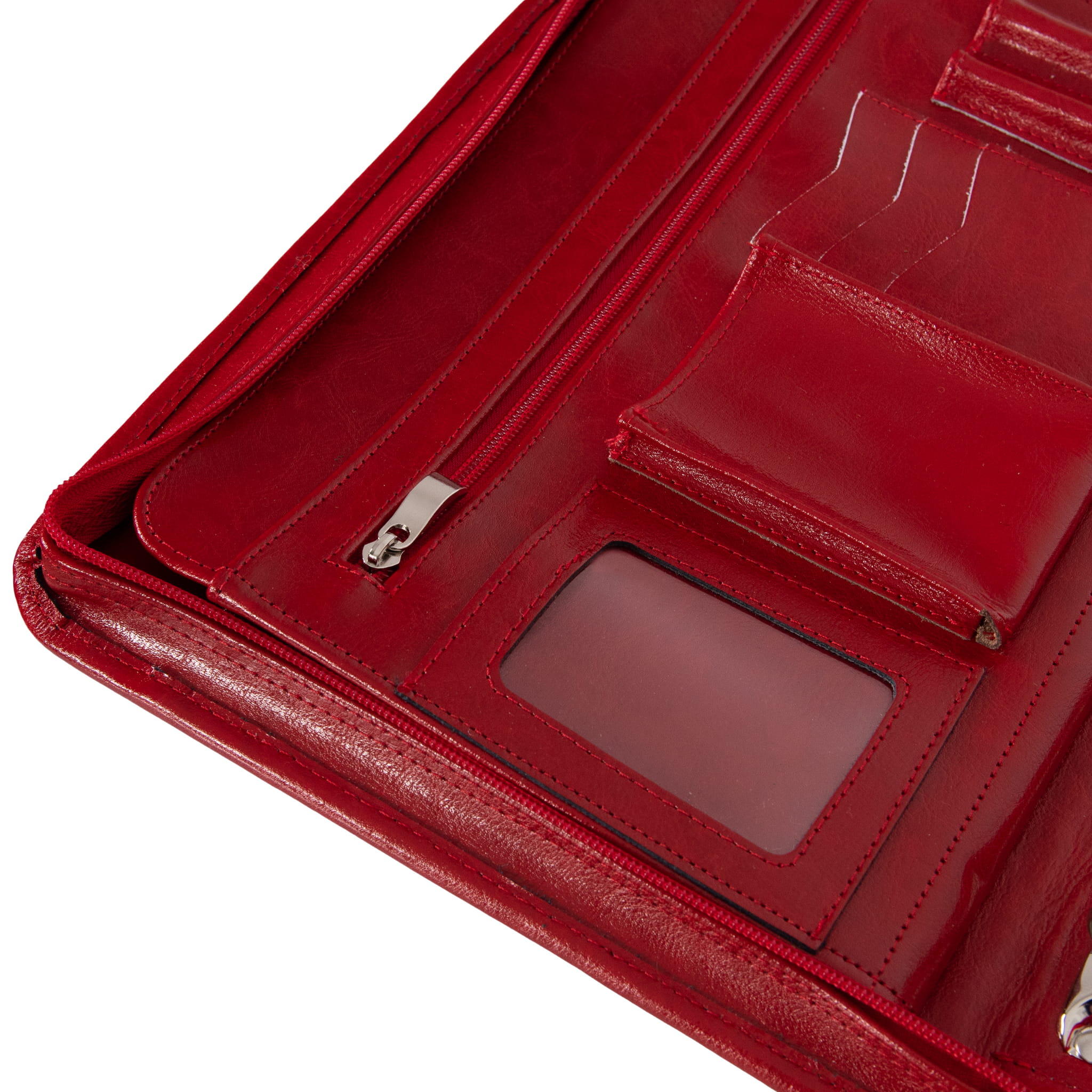 Skóra wykorzystana do stworzenia aktówki na dokumenty jest miękka w dotyku i niezwykle gładka. Odpowiednie przygotowanie materiału sprawia, że jest odporny na czynniki zewnętrzne, takie jak brud czy wilgoć. Kolor aktówki jest intensywny i trwały. Czerwień świetnie sprawdzi się zarówno w czasie eleganckich wyjść, jak i na co dzień.