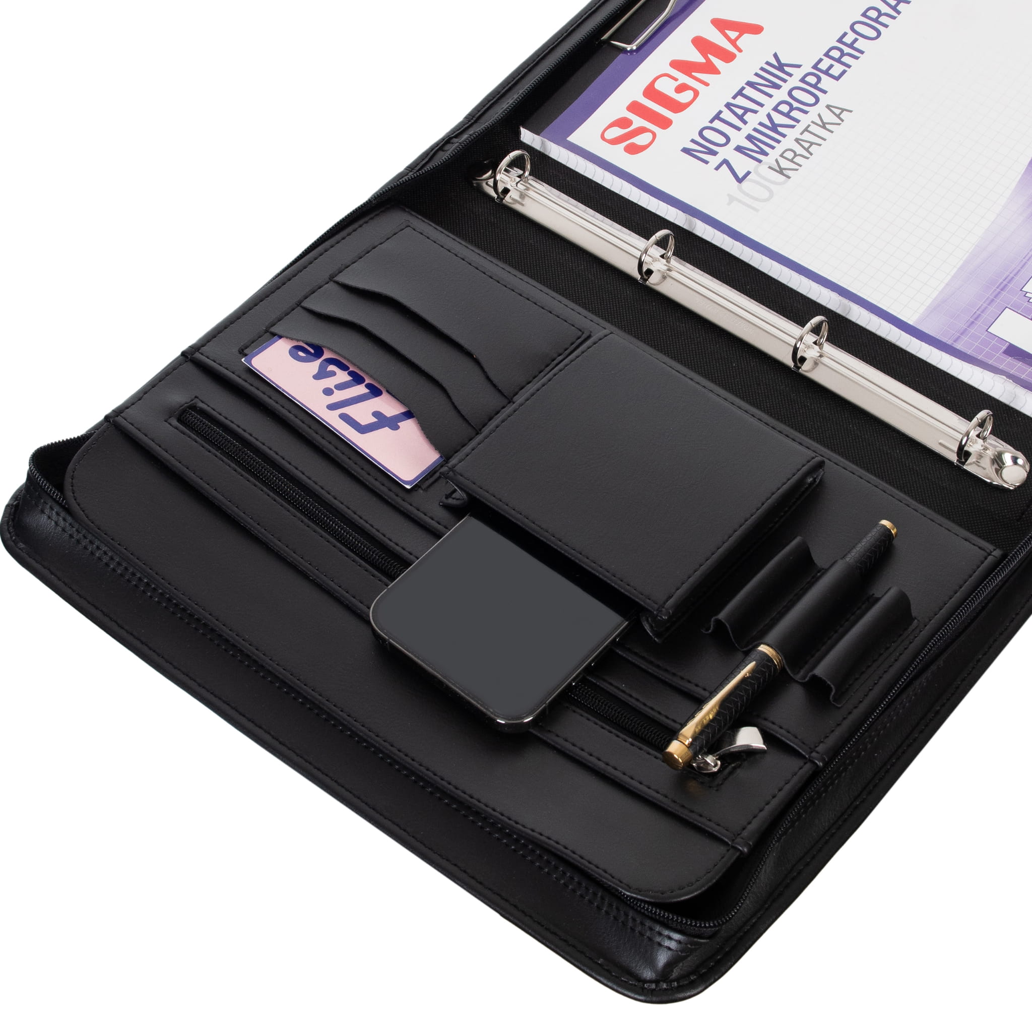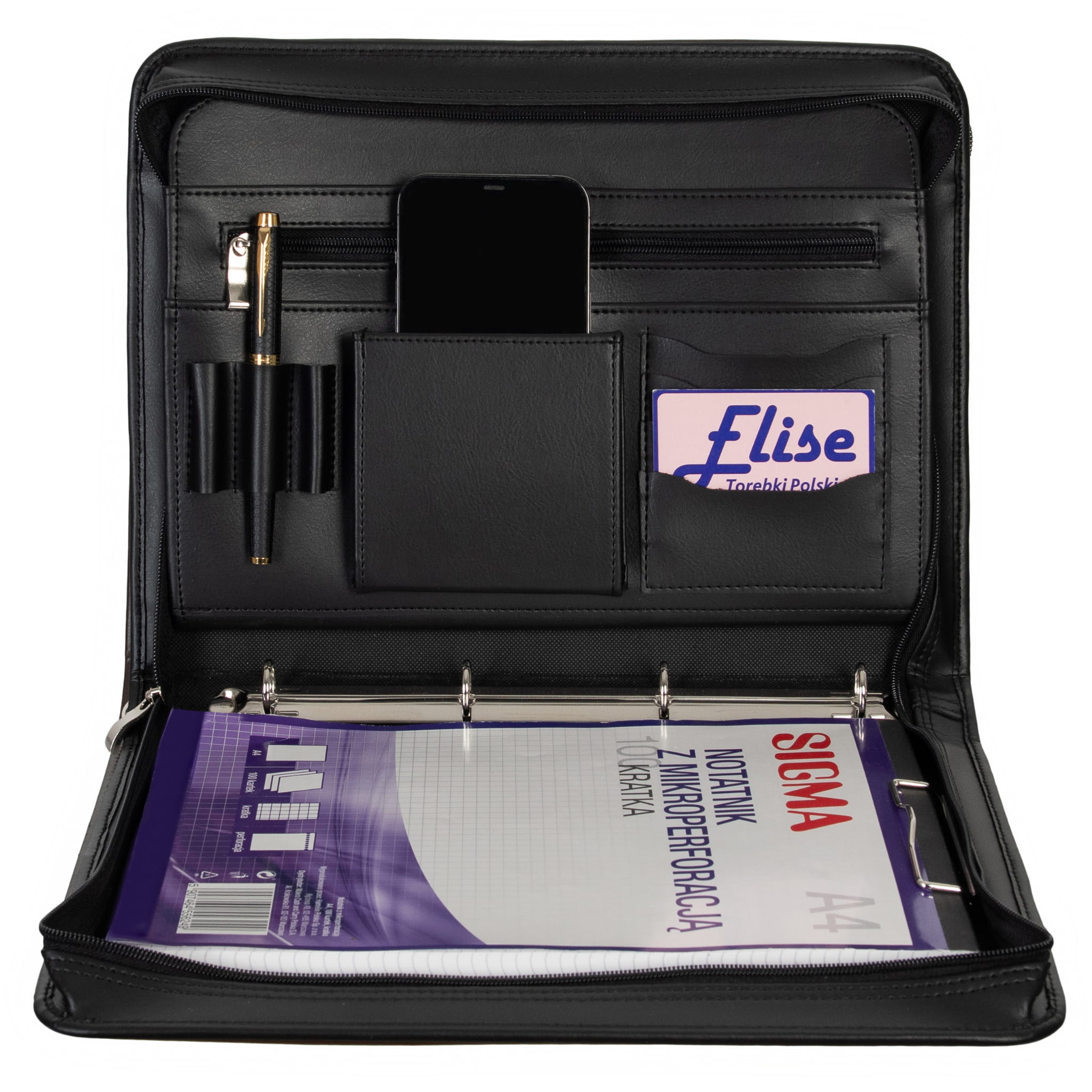- wewnątrz naszej aktówki znajdziesz 2 wygodne przegrody, miejsce na wizytówki i długopisy, a dodatkowo klips na dokumenty A4 oraz mechanizm ringowy na koszulki,