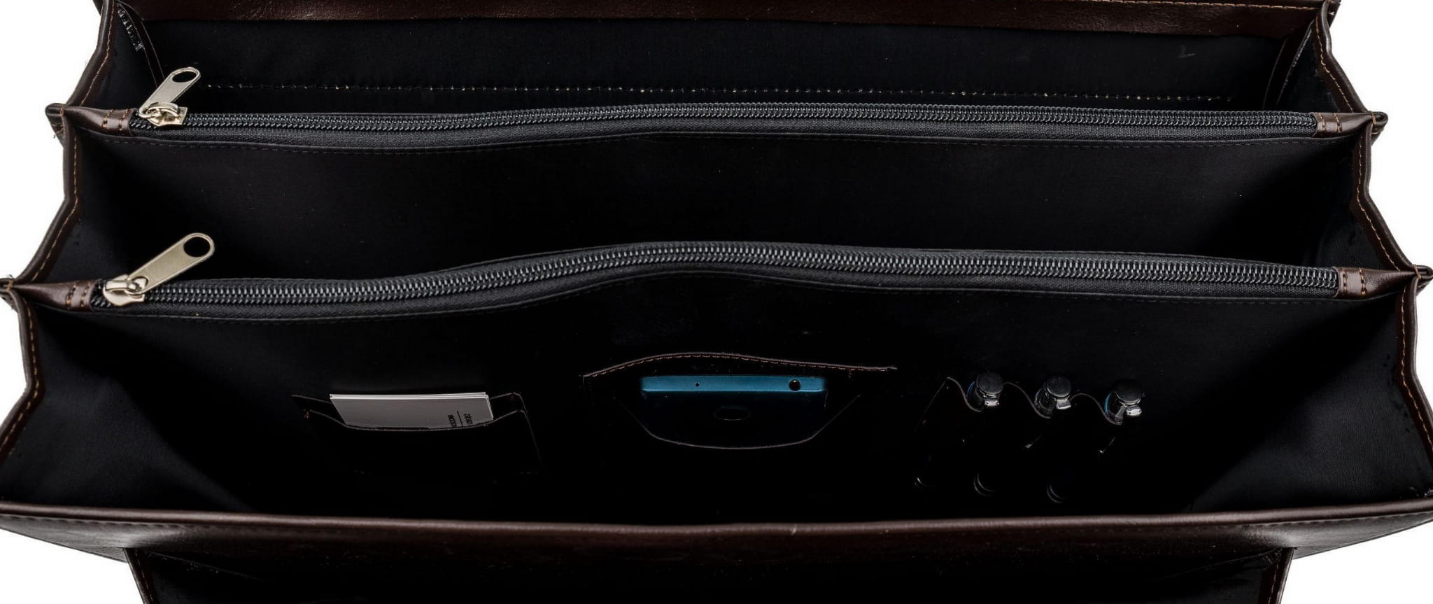 Wewnątrz teczki znajdują się 3 duże komory, a pomiędzy nimi 2 duże kieszenie na zamek, miejsce na komórkę, wizytówki oraz długopisy. Bez problemu zmieści laptop o wymiarach: 39cm x28cm x4cm