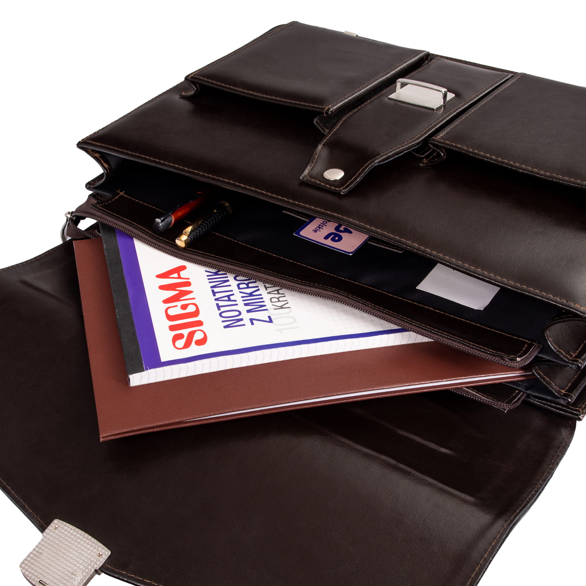 Wewnątrz teczki znajdują się 3 przestronne komory, w tym jedna zapinana na zamek. Z kolei na zewnątrz, w tylnej części, znajduje się niewielka kieszonka na drobiazgi. Dzięki dużej ilości przegród bez problemów zmieścisz w niej wszystkie niezbędne do pracy rzeczy.