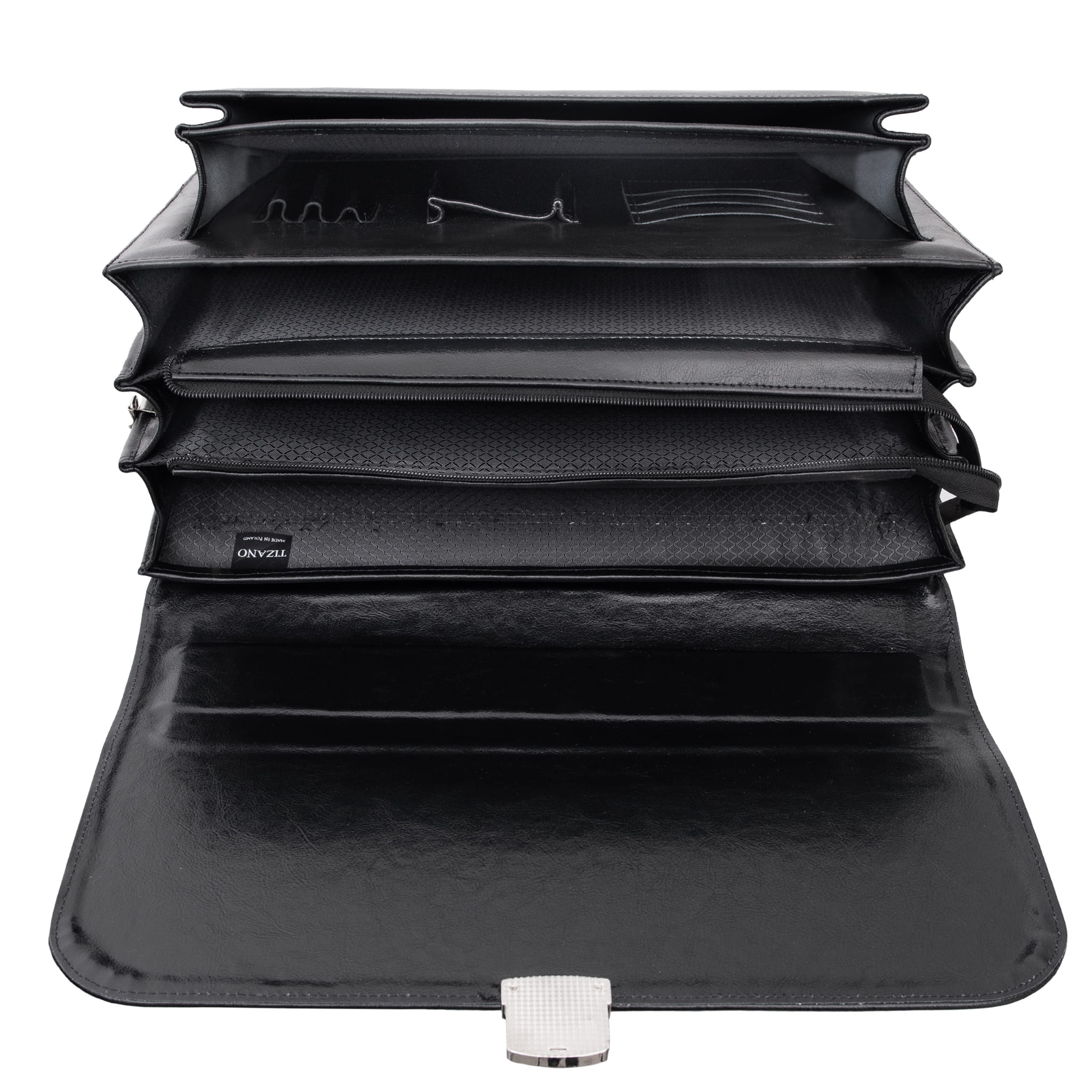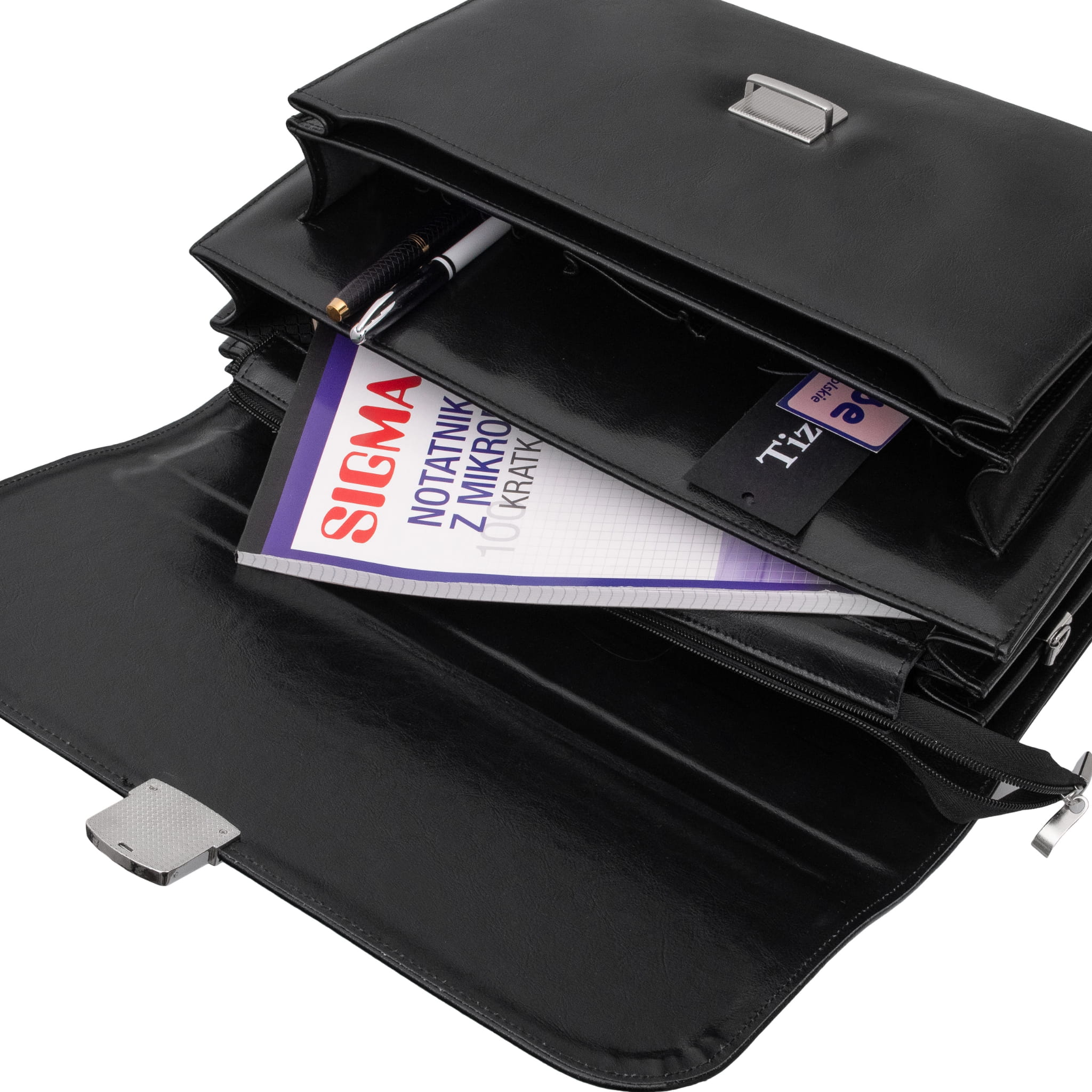 Wewnątrz teczki znajdują się 3 duże komory, w tym jedna zapinana na zamek - idealna na laptopa ( posiada dodatkowe zabezpieczenie po bokach oraz na dnie w postaci pianki, którą możesz wyjąć w każdej chwili) , miejsce na komórkę, wizytówki oraz długopisy. Bez problemu zmieści laptop o wymiarach 39cm x 28cm x 4cm