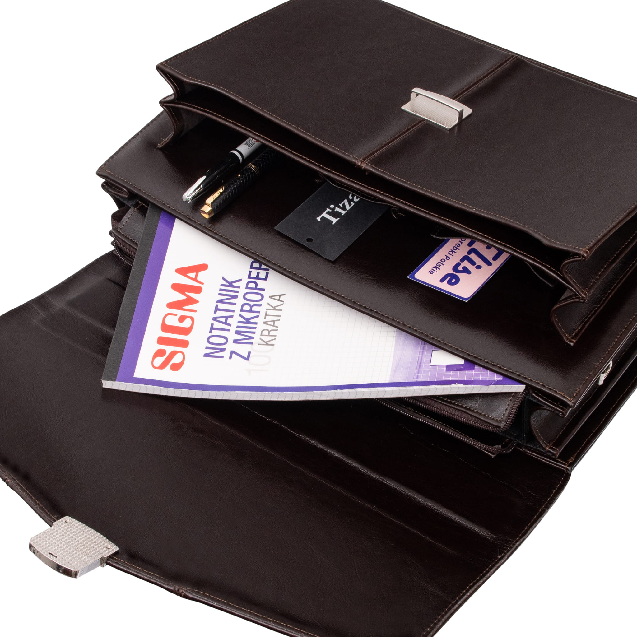 Wewnątrz teczki znajdują się 3 duże komory, w tym jedna zapinana na zamek - idealna na laptopa ( posiada dodatkowe zabezpieczenie po bokach oraz na dnie w postaci pianki, którą możesz wyjąć w każdej chwili) , miejsce na komórkę, wizytówki oraz długopisy. Bez problemu zmieści laptop o wymiarach 39cm x 28cm x 4cm