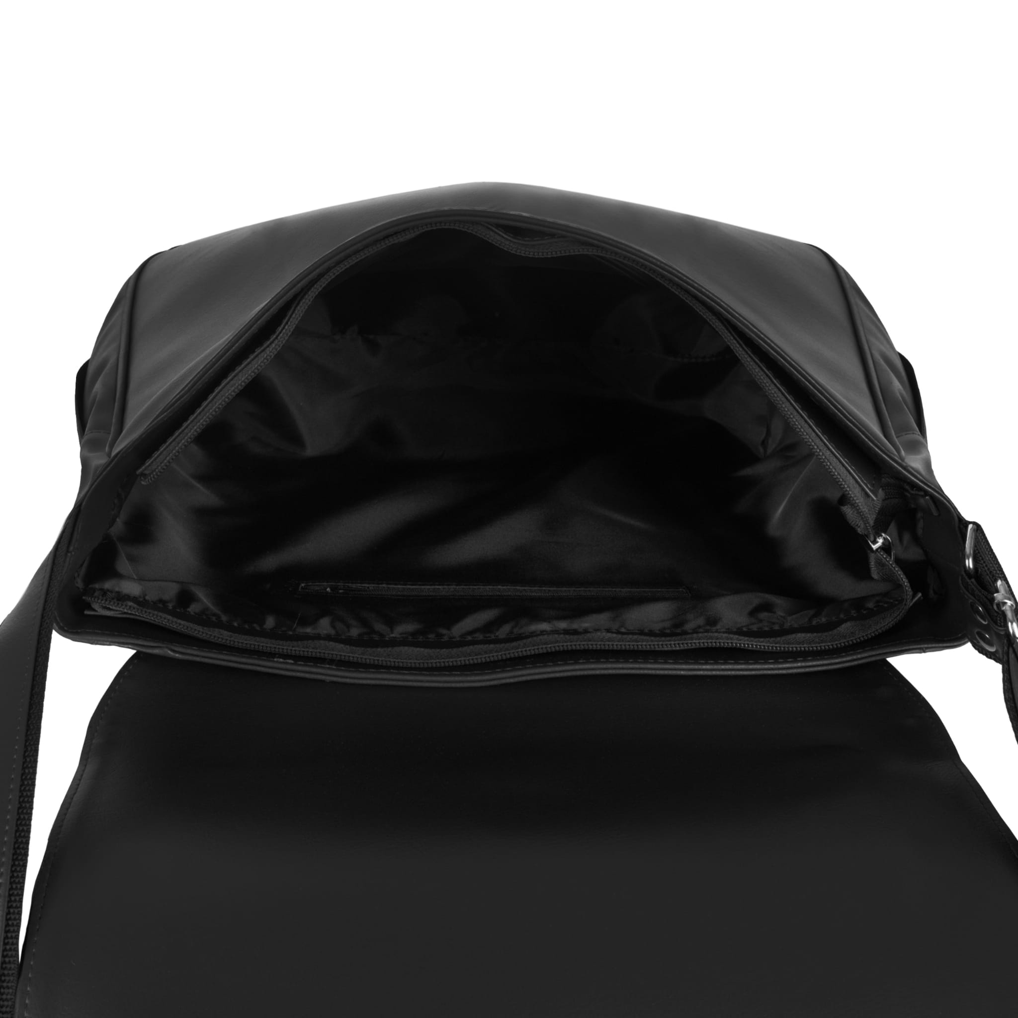W środku znajdziesz 1 dużą komorę oraz dodatkową kieszonkę na zamek. Jeśli niektóre drobiazgi, takie jak chusteczki albo klucze – wolisz mieć zawsze pod ręką, możesz włożyć je do tylnej kieszonki zapinanej na zamek lub drugiej umieszczonej z przodu na klapie.